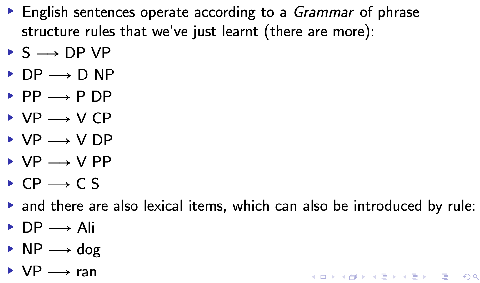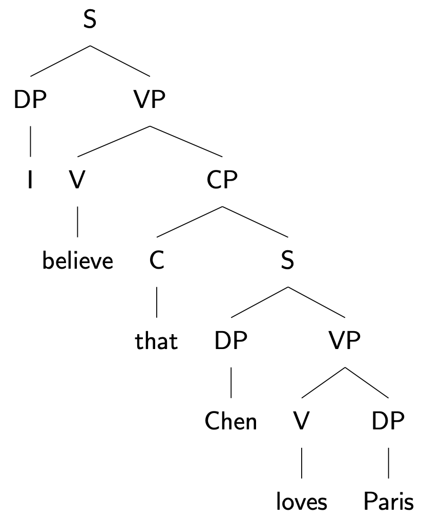 - VP (liked the movie) → V (liked) DP (the movie)